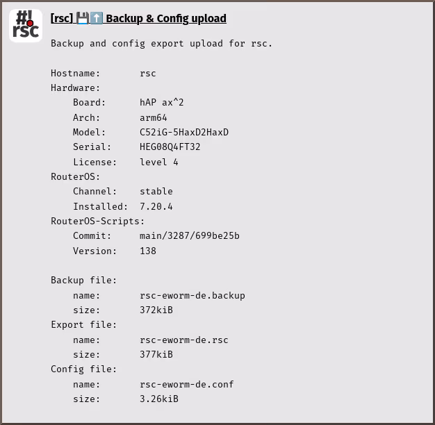 doc/backup-upload.d/notification.avif ----- >8 ----- [rsc] 💾️⬆️ Backup & Config upload Backup and config export upload for rsc. Hostname: rsc Hardware: Board: hAP ax^2 Arch: arm64 Model: C52iG-5HaxD2HaxD Serial: HEG08Q4FT32 License: level 4 RouterOS: Channel: stable Installed: 7.20.4 RouterOS-Scripts: Commit: main/3287/699be25b Version: 138 Backup file: name: rsc-eworm-de.backup size: 372kiB Export file: name: rsc-eworm-de.rsc size: 377kiB Config file: name: rsc-eworm-de.conf size: 3.26kiB ----- >8 -----